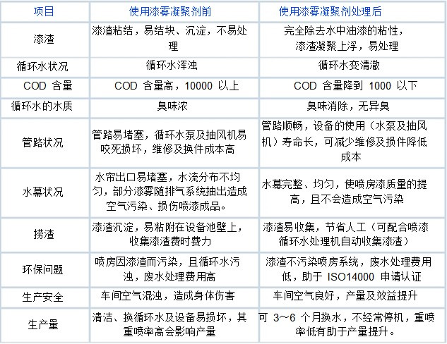 漆雾凝聚剂是喷漆行业喷油处理循环水中必备的添加剂,它的主要功能是:消除漆雾粘性,将漆雾凝结成絮团并使其浮在循环水表面,这样易于打捞清除(或自动控制除渣),从而使循环水固液分离、可长期使用、节约了水资源。